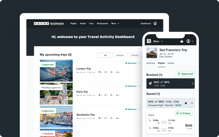 Nền tảng của chúng tôi chính là giải pháp tối ưu cho việc quản lý các chuyến công tác. Chào mừng đến với KAYAK Business.