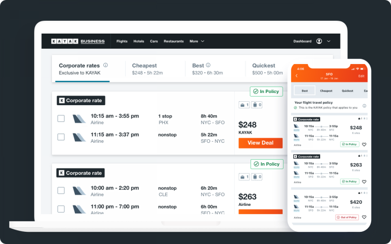 Nhận được tất cả các mức ưu đãi trên KAYAK, công cụ tìm kiếm du lịch hàng đầu thế giới, và tiếp cận được các mức giá khác dành riêng cho công ty cho các chuyến bay và khách sạn. Tất thảy đều không tốn phí.